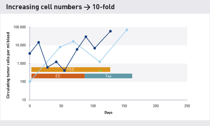 Jeśli liczba komórek stale wzrasta w trakcie terapii adiuwantowej lub wzrasta po początkowym spadku liczby komórek na początku leczenia, wówczas terapia nie jest już dłużej lub może nigdy nie była skuteczna. Komórki nowotworowe są nadal aktywne. W takim przypadku terapię należy zoptymalizować, ponieważ prognozy przyszłych wyników byłyby w przeciwnym razie niekorzystne. Tutaj maintrac® może sprawdzić w teście chemiowrażliwości, czy istnieją substancje, które mogłyby być bardziej skuteczne. Jeśli można zaobserwować ciągły wzrost liczby komórek lub ponad 10-krotny wzrost liczby komórek u pacjentów z rakiem piersi bez przerzutów, wówczas 65-70% przypadków dozna nawrotu w ciągu pierwszych 4-5 lat.