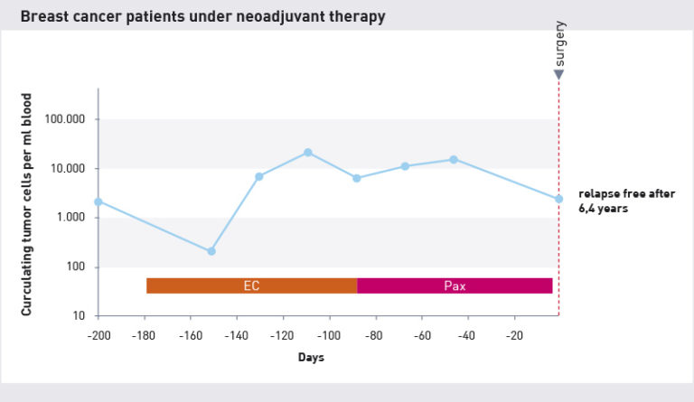 Doświadczenie pokazuje, że liczba krążących komórek nowotworowych we krwi zmniejsza się u pacjentów, gdzie zaobserwowano dobrą odpowiedź na leczenie po pierwszych 1-3 cyklach. Jeśli liczba komórek zmniejszy się i pozostanie na niskim poziomie do końca chemioterapii, oznacza to pozytywny, późniejszy przebieg leczenia. W badaniach z udziałem pacjentów z rakiem piersi bez przerzutów 90–95% pacjentów pozostawała wolna od nawrotów (bez nowych guzów) nawet po 4-5 latach, jeśli wcześniej wykazywała 10-krotny spadek liczby komórek.